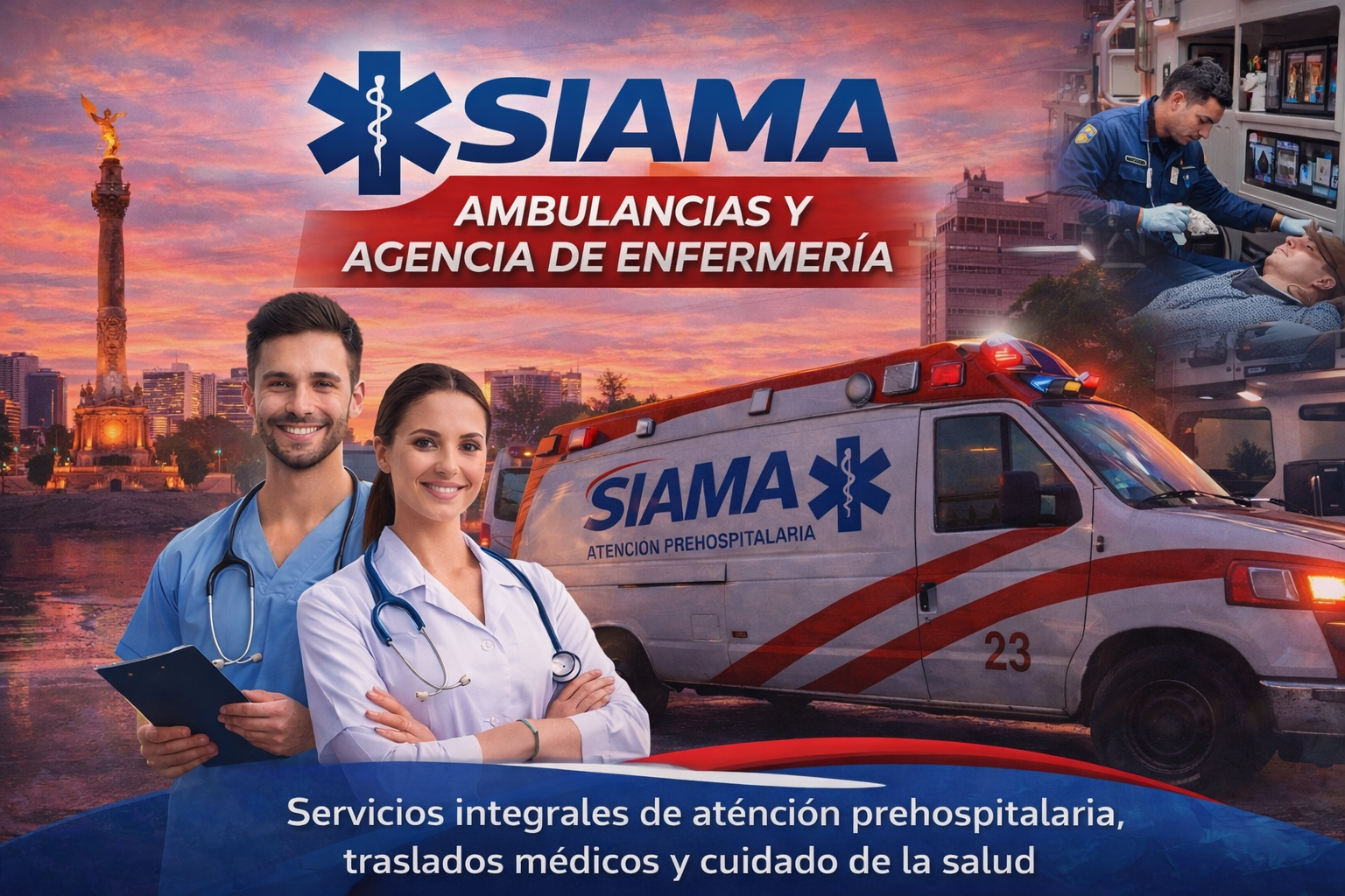 SIAMA Ambulancias y Agencia de Enfermería es una empresa mexicana especializada en servicios de ambulancias en CDMX, atención prehospitalaria y cuidado profesional de la salud, brindando atención médica rápida, segura y confiable las 24 horas.